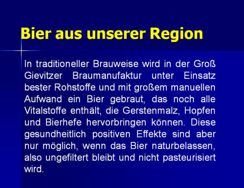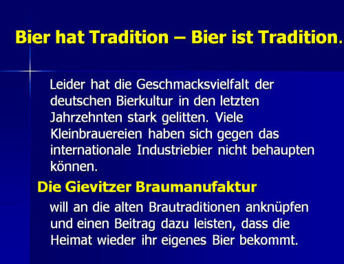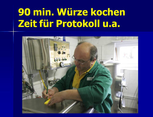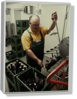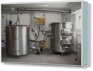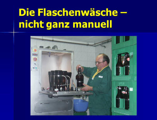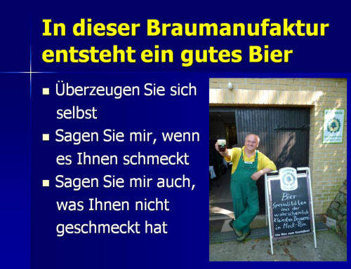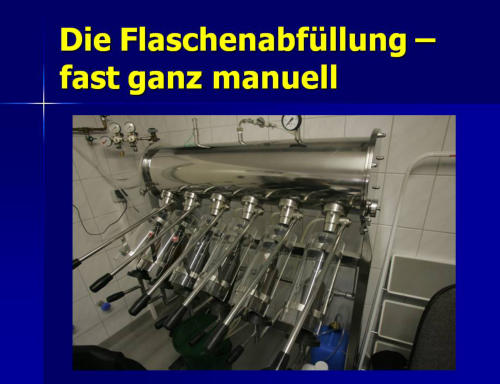 Die BraumanufakturMeine Brauerei ist ein Ein-Mann-Betrieb mit einer jährlichen Produktionsleistung von 12.000 bis 15.000 Liter Bier. Auf 70 m²ist hier alles vorhanden: Malzlager, Sudraum, Flaschenwäsche,Kühlraum und Produktlager.Die meisten Arbeitsprozesse sind reine Handarbeit. Lediglich der Maischprozeß und die Temperatur im Kühlraum werden automatisch gesteuert.